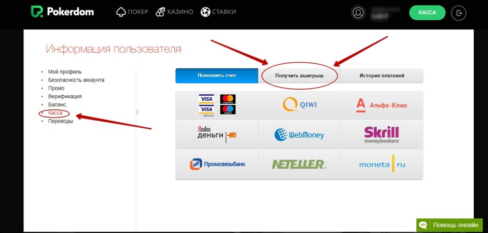 Финансовые аспекты важны каждому участнику игрового процесса, поэтому Касса является одним из главных инструментов покер-рума. Ее функционал не ограничивается пополнением и кэш-аутом. Данный раздел предоставляет пользователю информацию о наличии и размерах бонусов, а также состоянии их отыгрыша. Здесь же можно переводить деньги другим клиентам PokerDom и получать от них переводы.